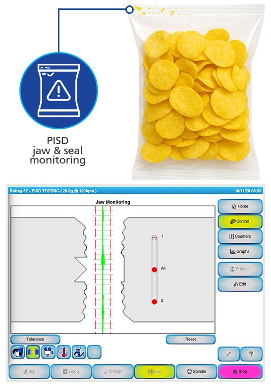 Available for tna robag® systems, PISD monitors the jaw and seal area in real time to detect faults caused by product in the seal or improper film folding, such as pleats. When a defined number of seal points fall outside preset tolerances, the faulty bag is ejected by the optional reject system — helping reduce waste and maintain consistent pack quality. This ensures only high-quality bags continue downstream.