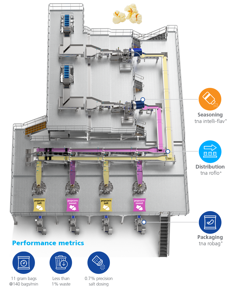 A leading popcorn brand turned to TNA to help scale production and elevate product quality — without adding complexity. The solution? A single, fully integrated line combining distribution, seasoning, and packaging in one seamless system.